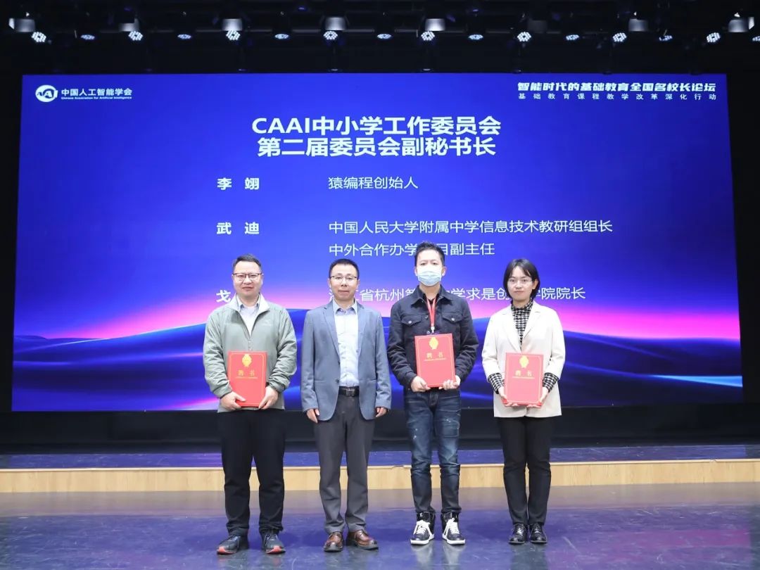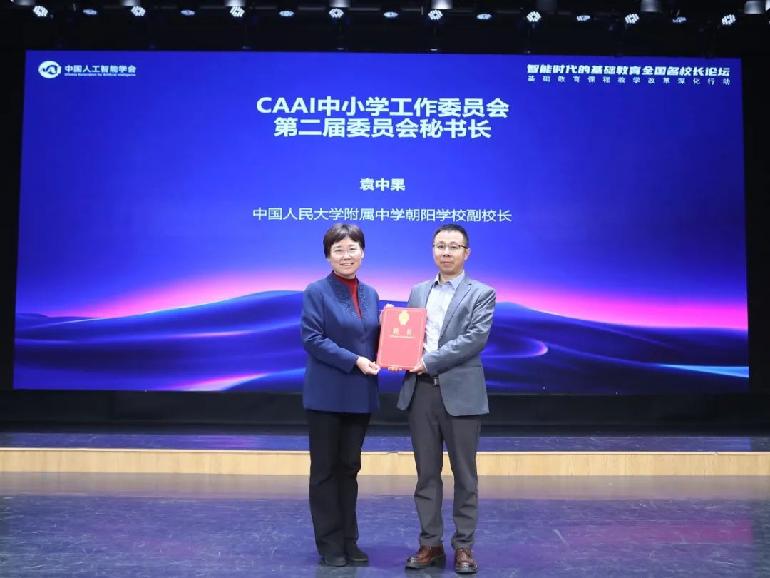 论坛的开幕式由中国人民大学附属中学暨联合学校总校党委副书记王晓楠主持。在开幕式上,CAAI 副理事长刘成林研究员宣读了CAAI 中小学工作委员会第二届负责人名单,其中中国人民大学附属中学刘小惠校长当选主任委员,杭州外国语学校王华琪校长、成都七中育才学校党委书记吴明平、洛阳市第一高级中学宋富有校长、武汉市神龙小学教育集团韩瑾校长、中国人大附中朝阳学校袁中果副校长(同时兼任秘书长)、深圳清华大学研究院下一代互联网研发中心龚超副研究员、北京汇文中学党委书记郭杰、深圳中学郭峰副校长当选副主任委员。猿编程创始人李翊、人大附中信息技术教研组组长武迪、杭州第二中学求实创新学院戈航院长被任命为副秘书长。CAAI 理事长戴琼海院士和CAAI 副理事长刘成林研究员为他们颁发了聘书。