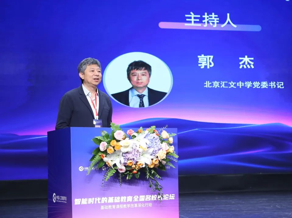 论坛由四个版块的主旨报告构成,第一版块由北京汇文中学党委书记、东城区杰出校长郭杰主持。首位报告嘉宾熊璋教授在报告中回顾了全球人工智能技术的迅猛发展及其对教育的冲击,例如大语言模型、多模态生成技术等,这些新技术不仅对教育模式提出挑战,也带来创新的契机。充分利用人工智能和人工智能+行动的机遇,赋能教育创新和教育高质量发展是时代趋势,也是教育强国建设的重要一环。他指出,构建中国的教育新生态需要关注五个环节:教育信创、科学与素质教育、小步快跑的实践和全域数字孪生。他认为,以开源代码为契机,中国有机会在未来教育的数字化和智能化中占据优势。